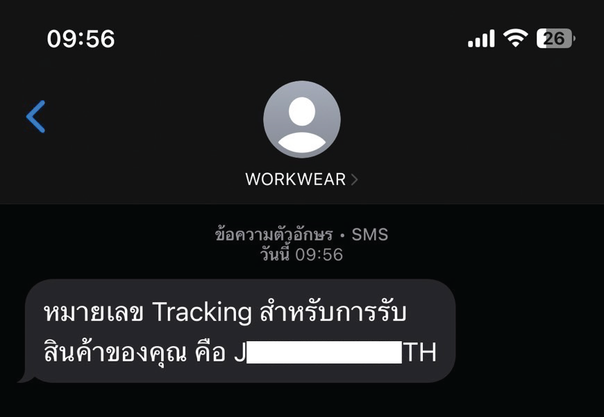 แบบข้อความ SMS ที่ทางบริษัทฯ ใช้ส่งข้อมูลให้คุณลูกค้า จะใช้ชื่อว่า WORKWEAR THAILAND เท่านั้น