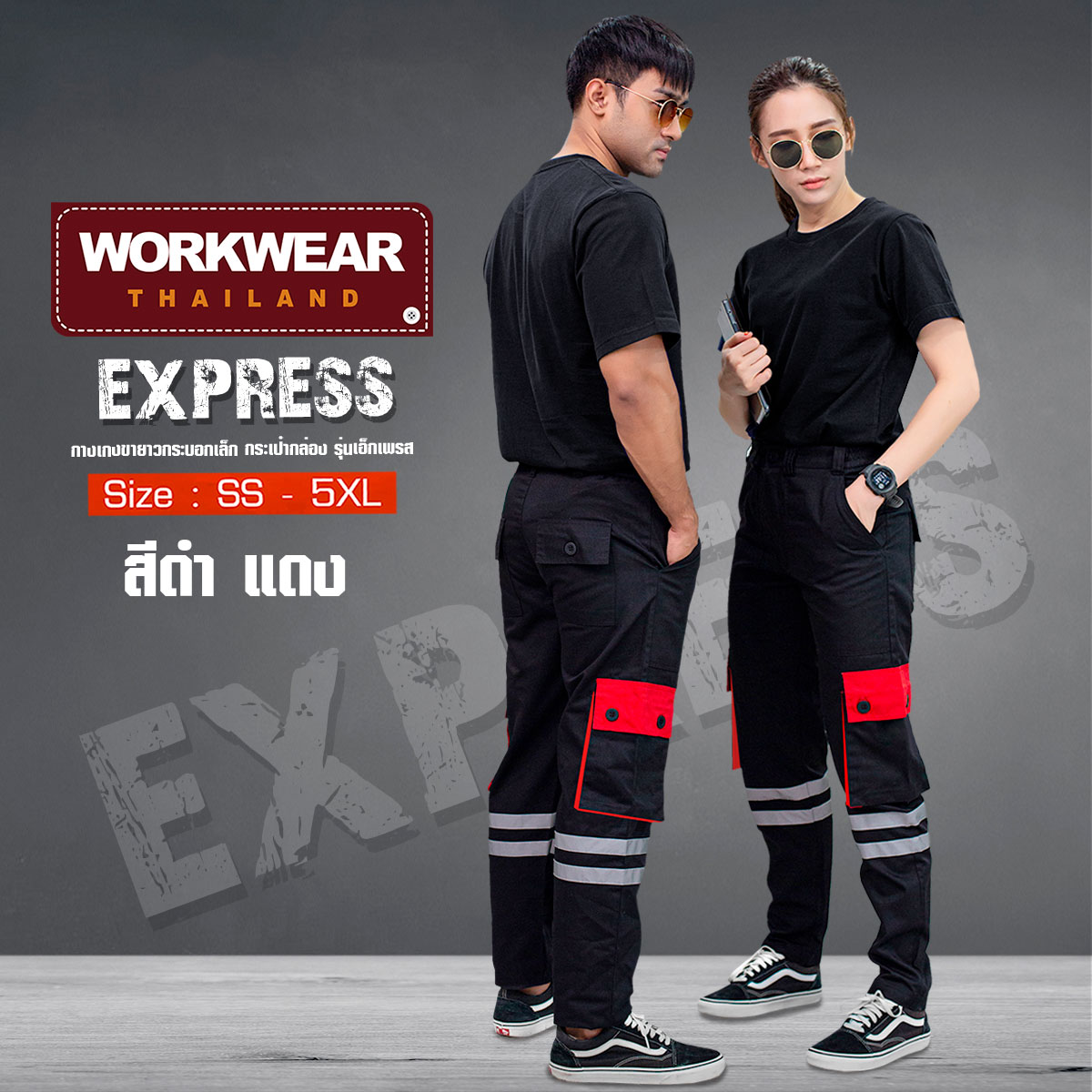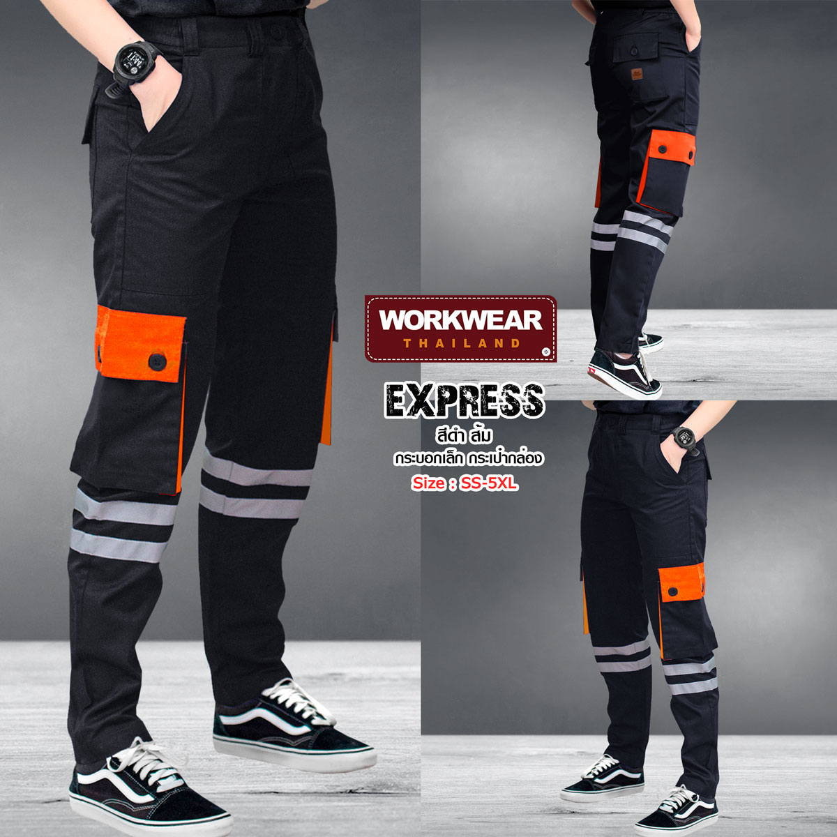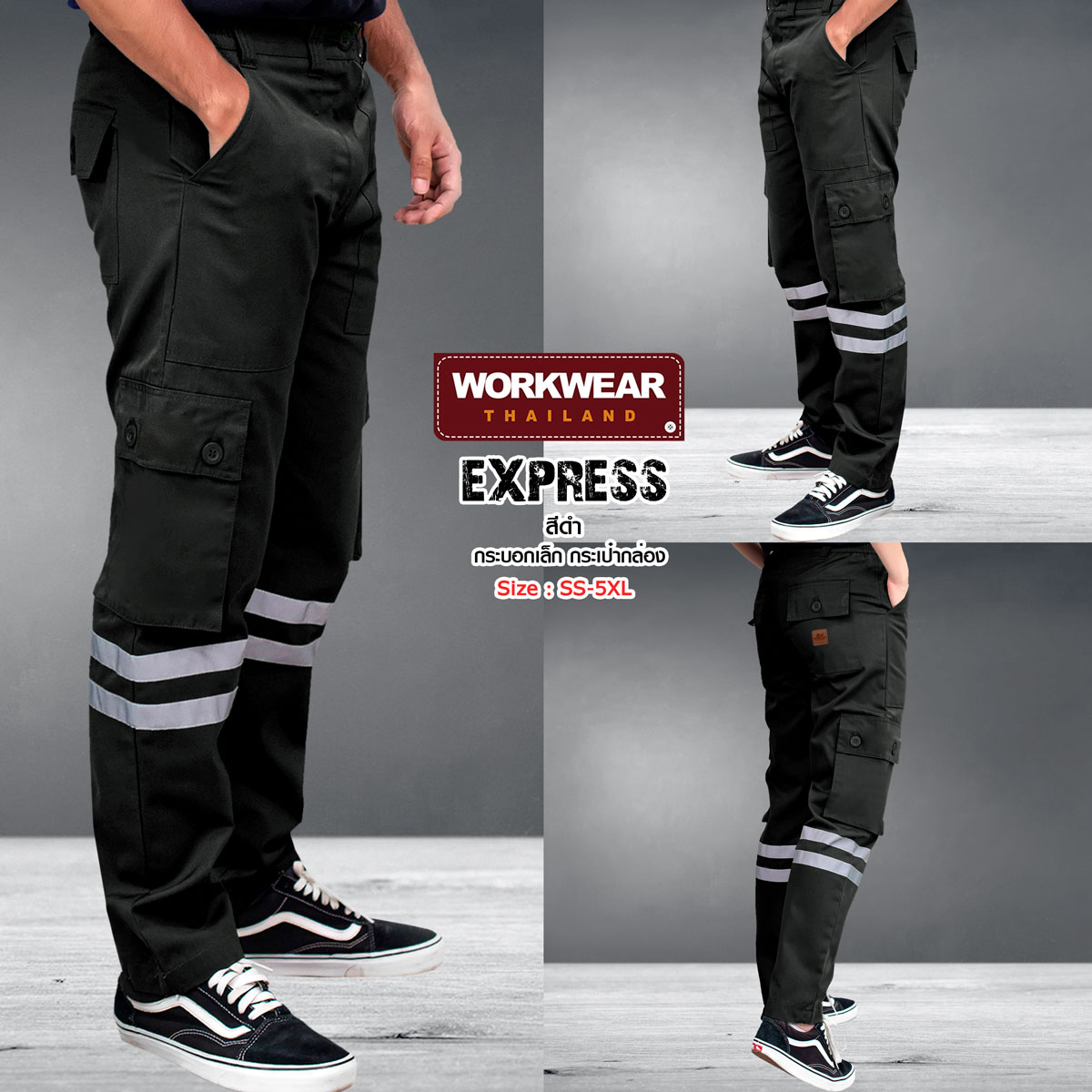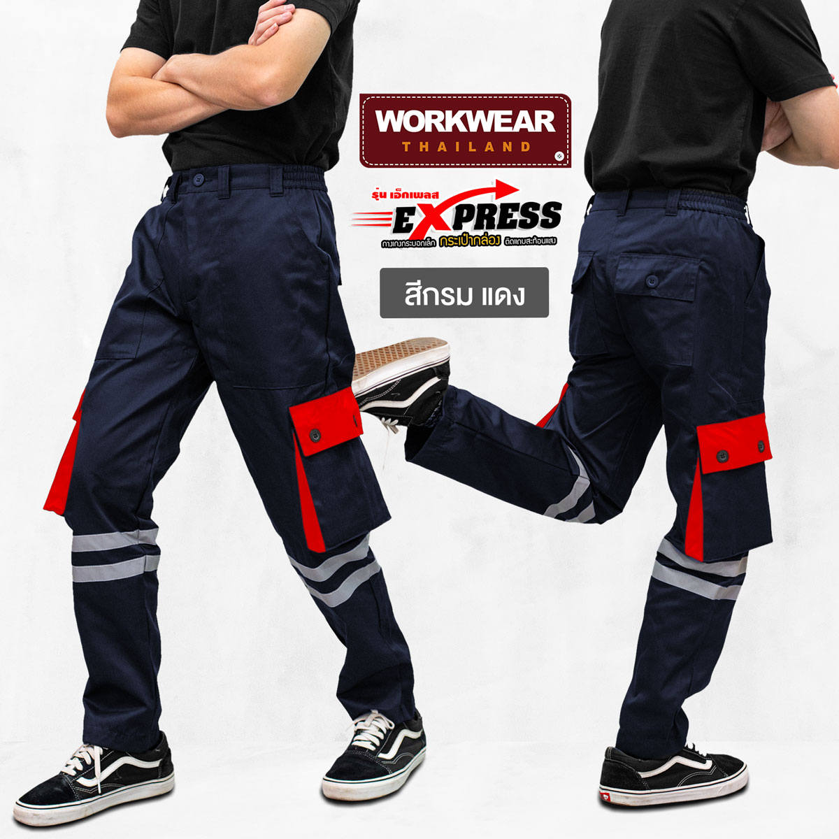กางเกงขายาว รุ่น EXPRESS ทรงกระบอกเล็ก คาดแถบสะท้อนแสง เส้นคู่ กระเป๋าข้างกล่อง